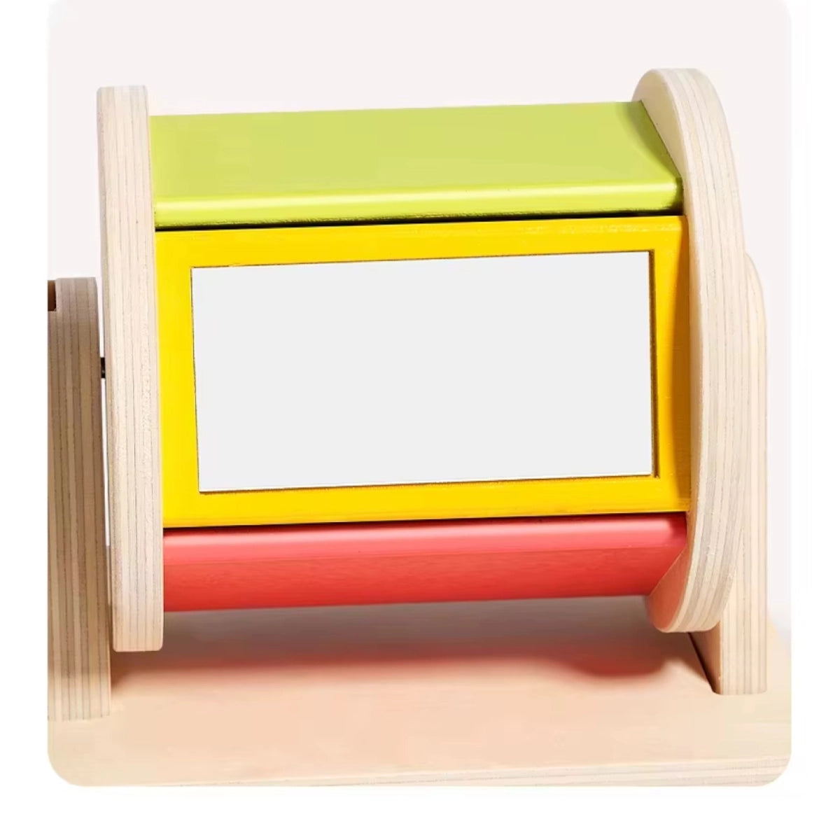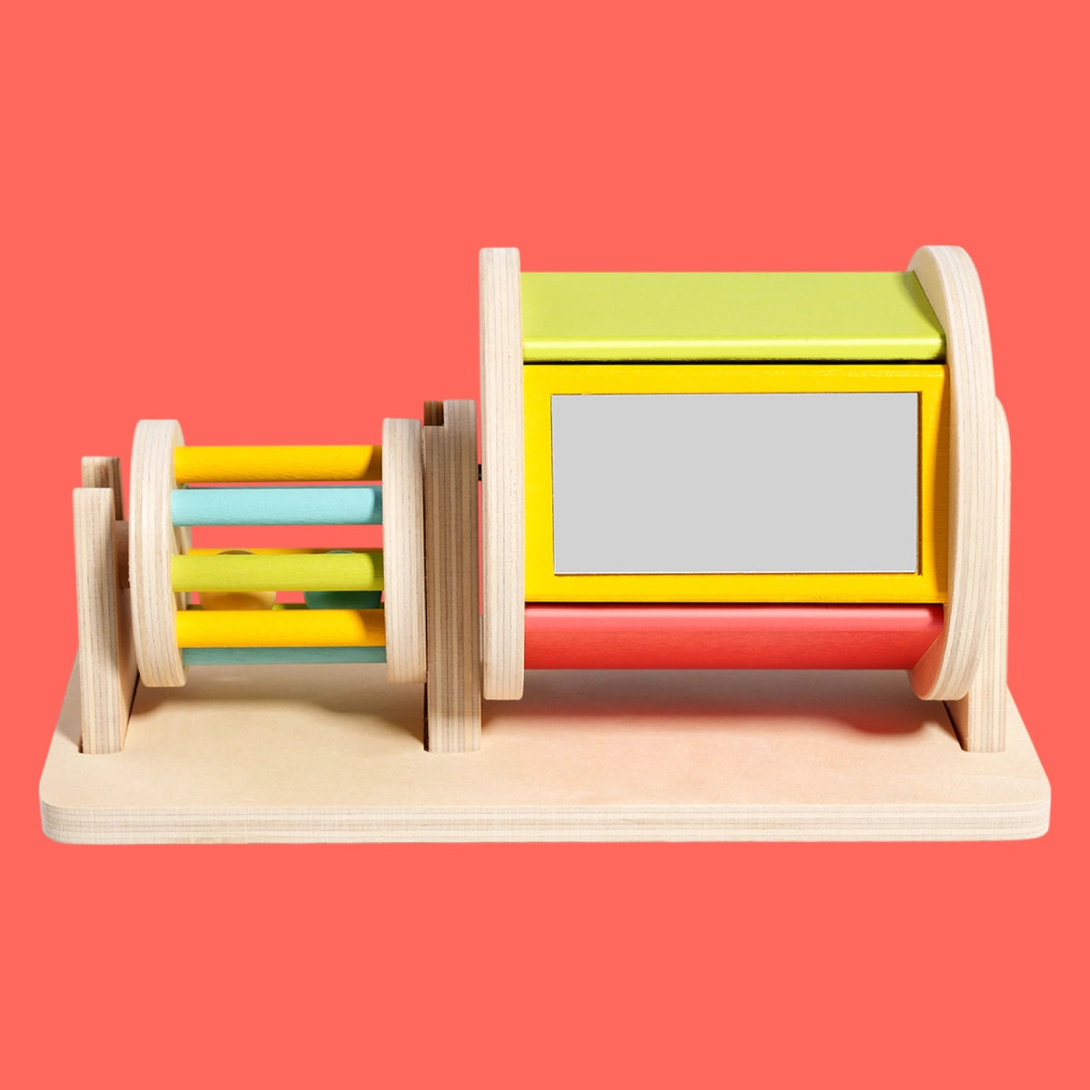 Drveni rotirajući bubanj u nježnim bojama i ogledalom, savršena je igračka za "vrijeme trbuščića", odnosno dijetetu stvara poticaj kako bi što više vremena provodilo na trbuhu.