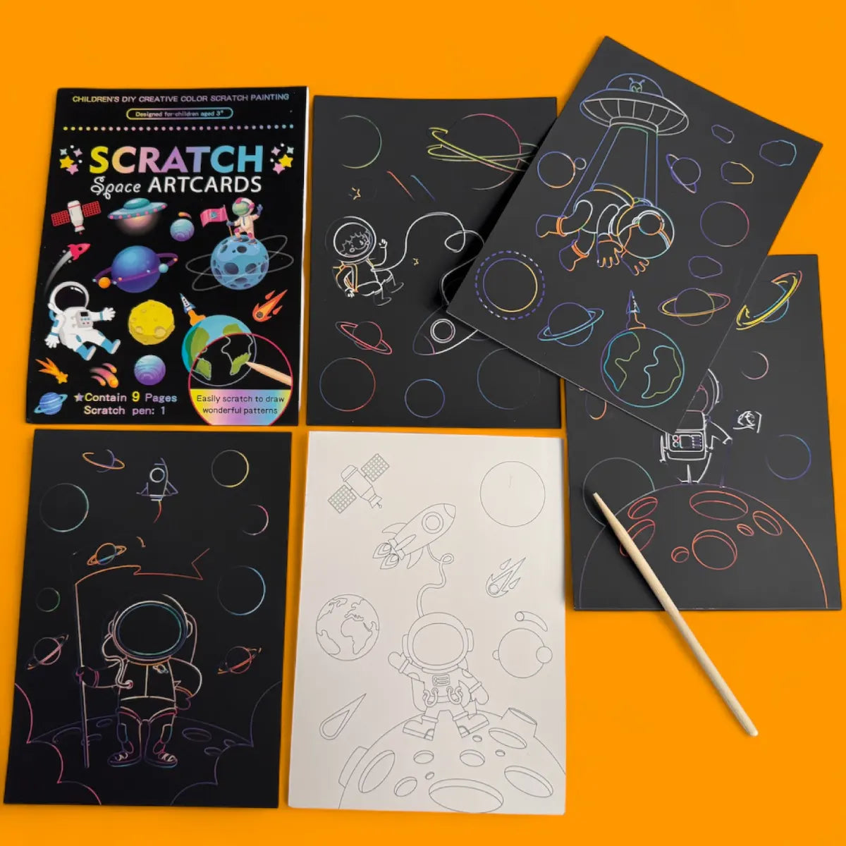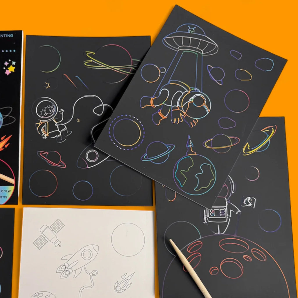 Poletite u nevjerojatnu svemirsku avanturu s našom bilježnicom grebalicom s motivima svemira! Ova kreativna aktivnost savršena je za djecu svih uzrasta koja vole crtanje, bojanje i otkrivanje skrivenih slika planeta, raketa i astronauta. Bilježnica grebalica s motivima svemira idealan je poklon za male astronaute i odličan način za razvoj fine motorike bez ekrana.