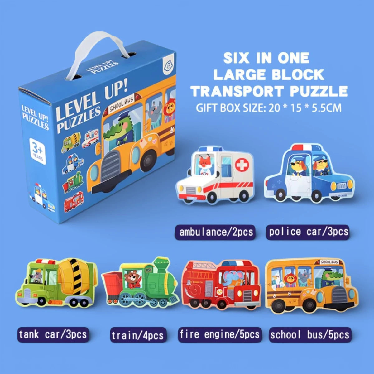 Ovaj set edukativnih puzzli za djecu sadrži više slagalica različitih težina, prilagođenih razvojnim fazama mališana. Svaka slagalica ima velike, lako uhvatljive dijelove i zanimljive motive poput životinja, vozila, voća, brojeva i slova, što potiče vizualno prepoznavanje i učenje kroz igru.